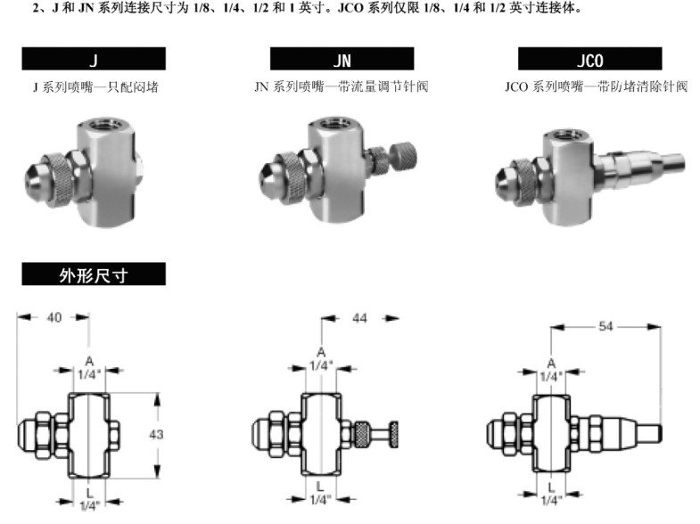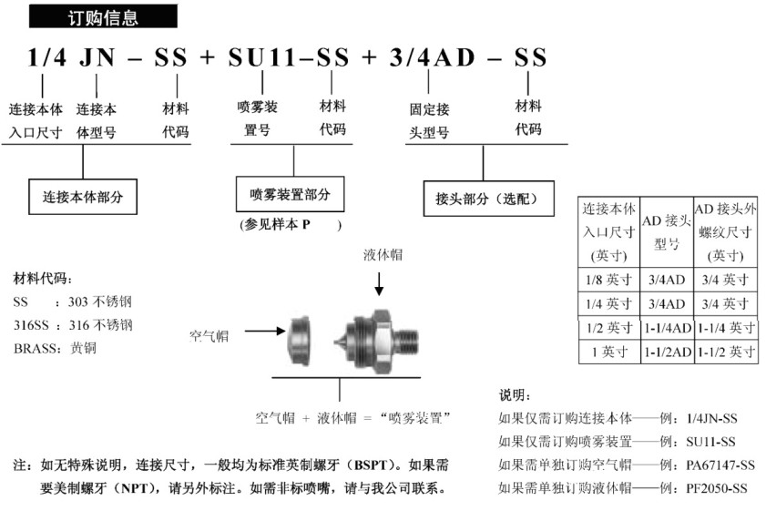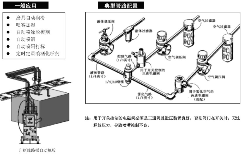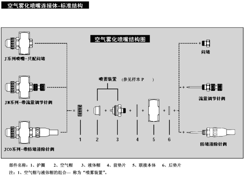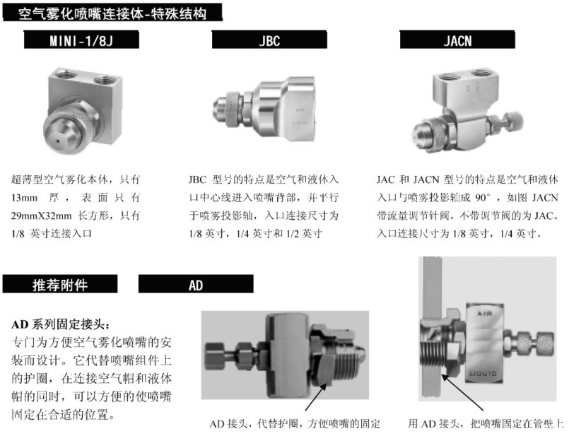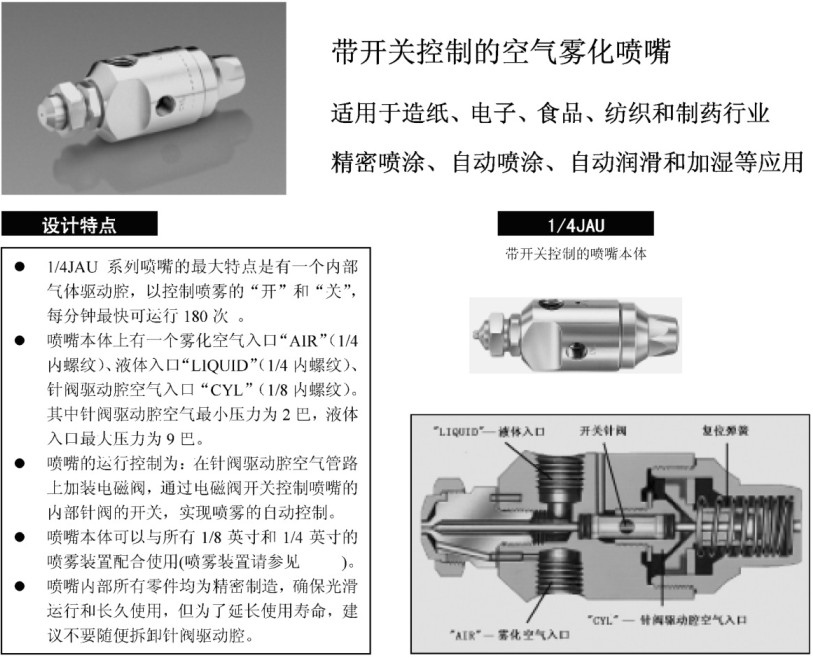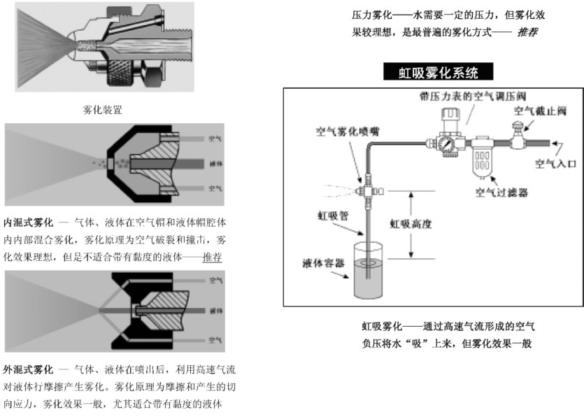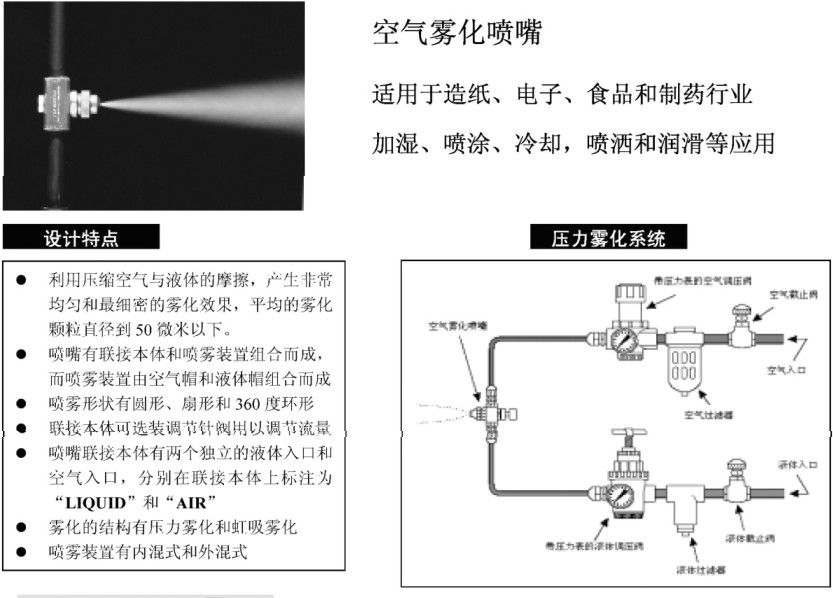 也稱為二流體噴嘴、雙流體噴嘴??諝忪F化噴嘴是所有噴霧噴嘴類型中最為通用的類型,一般適用于很多應(yīng)用,例如沖模潤滑、噴霧噴涂、濕潤、加濕、煙氣調(diào)質(zhì)和粉塵控制。 擁有成百上千的可用尺寸和類型,包含壓力或虹吸輸送、內(nèi)部或外部混合噴頭、大范圍的噴霧形狀以及各種材料。 需要液體管路和霧化空氣的空氣源。 有些噴嘴需要第二個氣體管,用于自動氣缸操作,清掃或關(guān)閉。