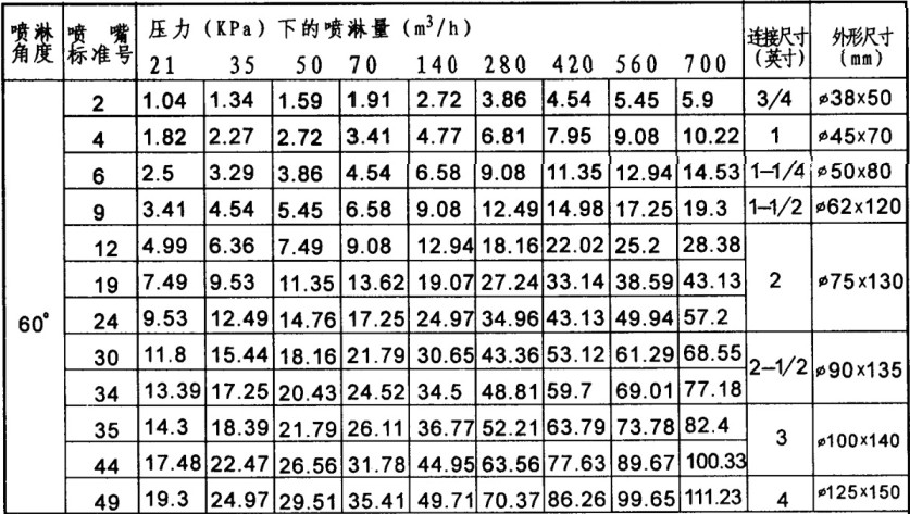 壓力/流量比值較小。內(nèi)件為多頭螺旋,切割能力強(qiáng)。啟噴壓力小,操作彈性大。渦旋流型噴嘴中液滴直徑最小,易霧化。液滴直徑分布均勻。噴淋密度分布均勻。推薦噴淋角度:60°,90°,120°。常用材料:聚丙烯(PP);聚氯乙烯(PVC);ABS;聚四氟乙烯(PTFE。